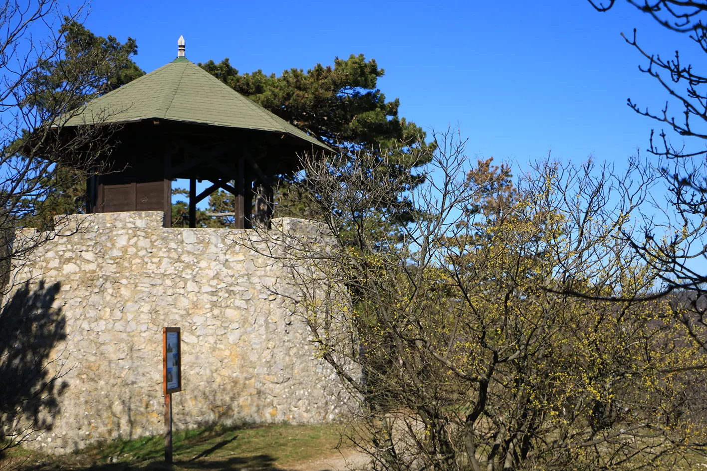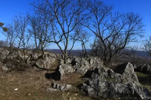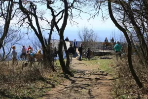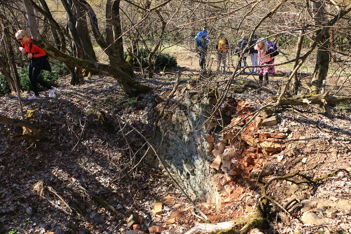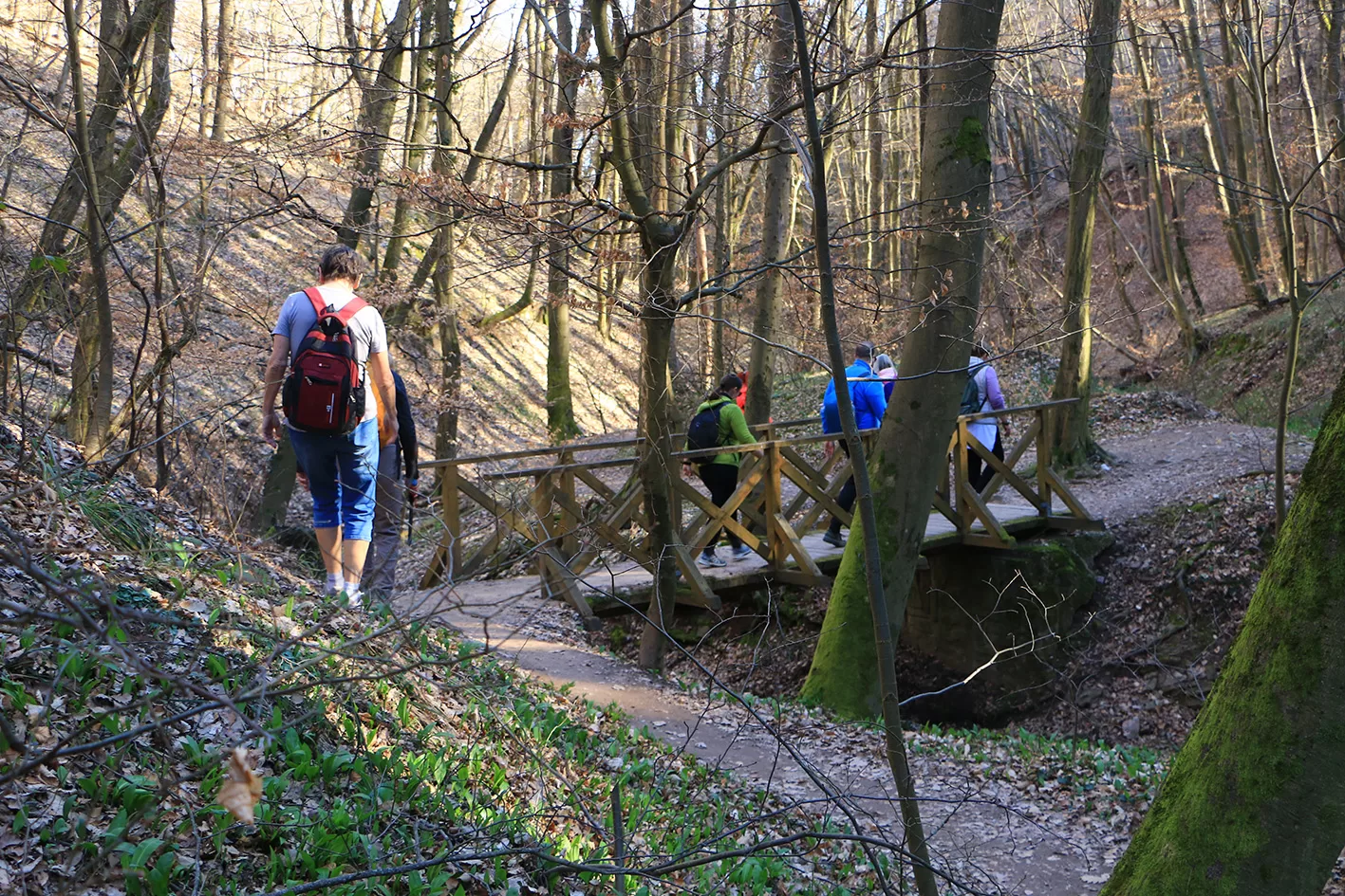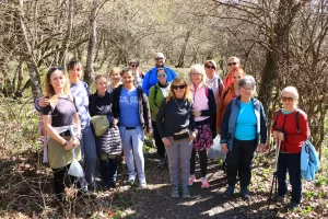 A János-kilátóból a pompás körpanorámát csodáltuk, majd a medvehagymával és hóvirággal borított szerpentinösvényen lesétáltunk a Lapisra. Innen gyorsan a Sós-hegy kilátójához értünk, ahol ismét megcsodáltuk a mecseki tájat. A Remete-rét pihenője után felkapaszkodtunk a Vörös-hegyre, majd bekukkantottunk az egykori mészégető romjaihoz, így érkeztünk a Szuadó-nyeregbe.